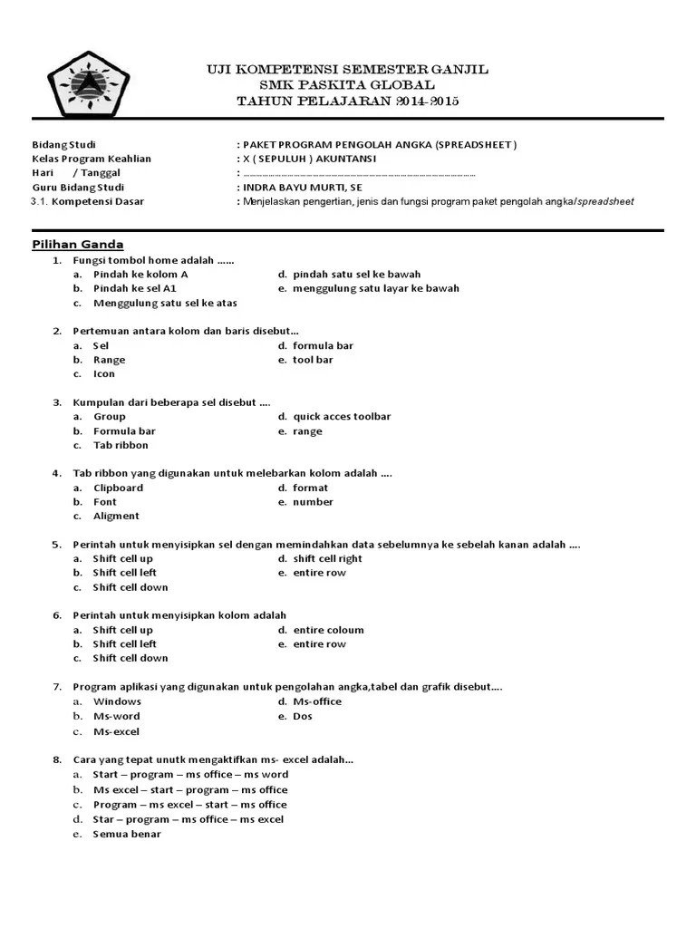 Berilah tanda silang (x) pada huruf a, b, c, d, atau e pada jawaban yang paling tepat! Jika jawaban kalian sama sekali berbeda pada soal atau langkah tertentu . Gunakan modul ini bersama dengan buku aplikasi pengolah angka kelas x smk. Ikhtisar keuangan sebagai pertanggung jawaban pimpinan perusahaan kunci : Soal pilihan ganda spreadsheet x akuntansi tahun 2018/2019 semester ganjil kurikulum 2013 (hots).
